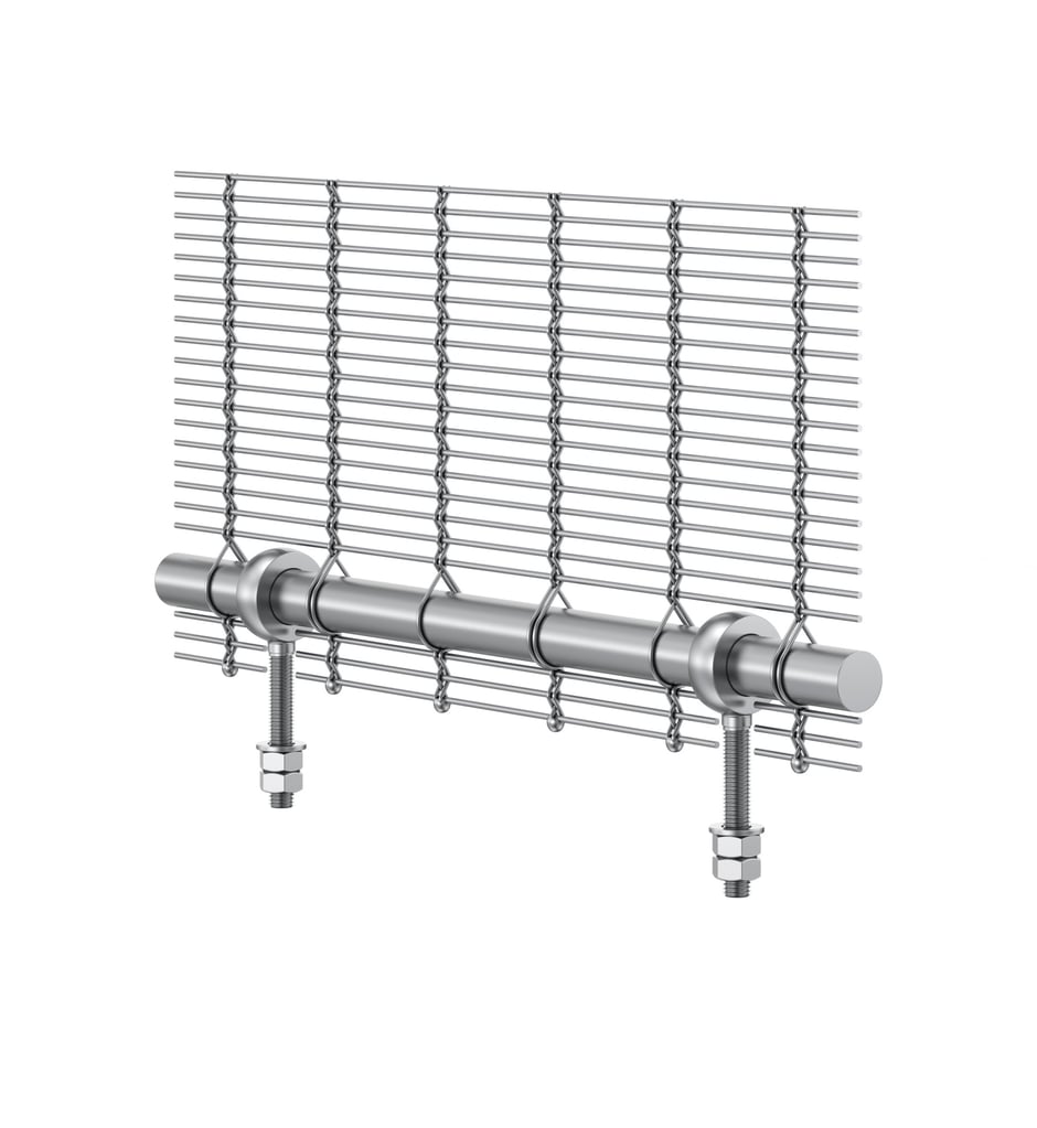 Für Seilgewebe. Bei dem Befestigungssystem eingeschobene Rundstange + Augenschrauben werden Schussdrähte aus dem Metallgewebe entfernt und durch eine lastverteilende Rundstange ersetzt. Mittels Augenschrauben wird das Edelstahlgewebe gegen eine Unterkonstruktion verspannt. Dieses Befestigungssystem ist für Seilgewebe mit Gruppen von Kettseilen geeignet.
