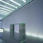 Horizontal verschiebbare Sonnenschutzpaneele aus Edelstahl-Spezialgewebe Omega 1508 mit besonderer Gewebedichte; freie Sicht von innen nach außen, während das Tageslicht differenziert ins Gebäudeinnere gelenkt wird – bei gleichzeitiger Einhaltung der geforderten Sonnenschutzwerte; semitransparente Reflexionsfläche für Lichter und Farben.