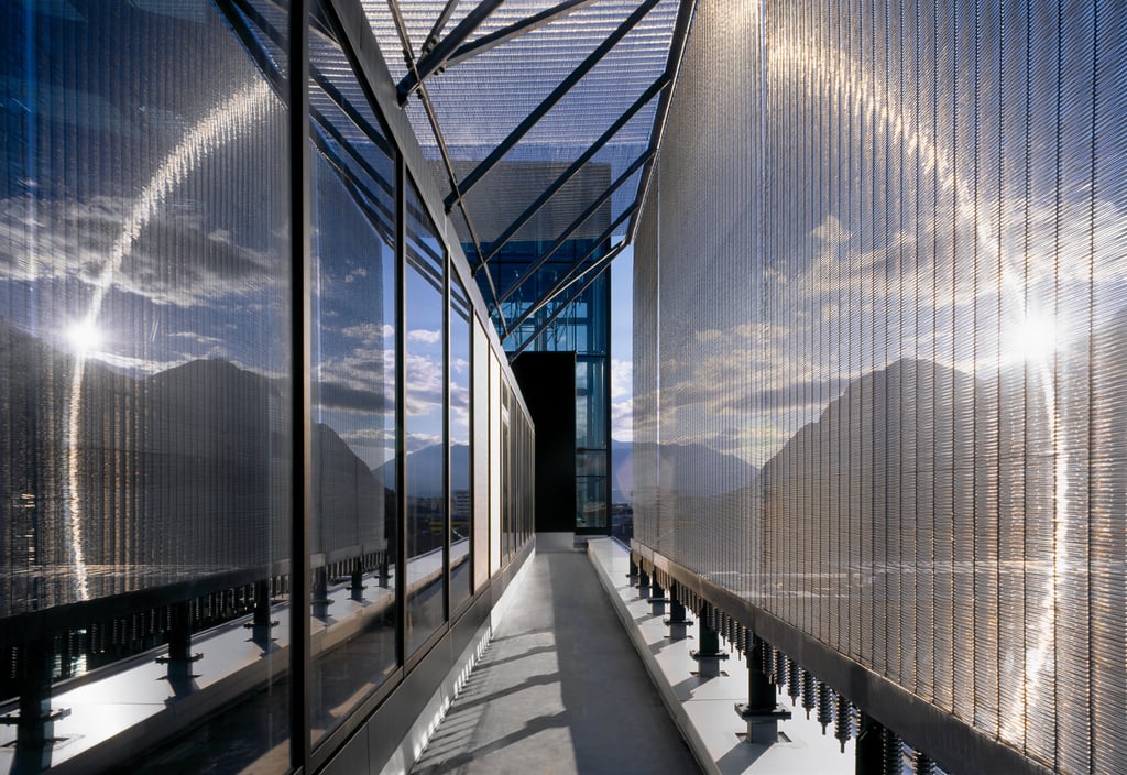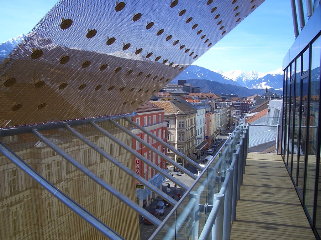 Nahtlose, trapezförmig gebogene Verkleidung des Glasdaches und der angrenzenden Fassade; effizienter Sonnenschutz mit unverstellter Sicht nach außen; interessante optische Wirkung und Lichtbrechung durch die leicht verschobenen Schussdrähte des Architekturgewebes Canisse (Sonderanfertigung); changierender Moiré-Effekte an den Eckpunkten der Gewebekonstruktion in der Außenansicht; präzise ausbalancierte und extrem stark gespannte Gewebebahnen, die Wind- und Schneelasten zuverlässig standhalten.