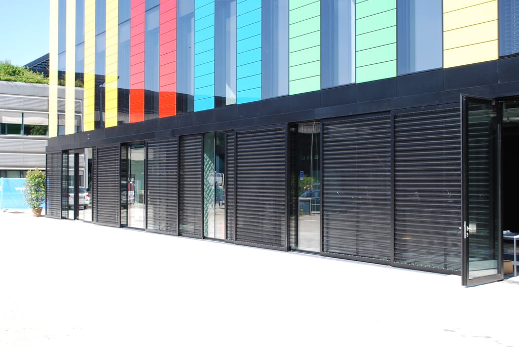 Metallgewebe in verschiebbaren Rahmen dient an der EPFL in Lausanne als variabler und architektonisch reizvoller Sonnenschutz.