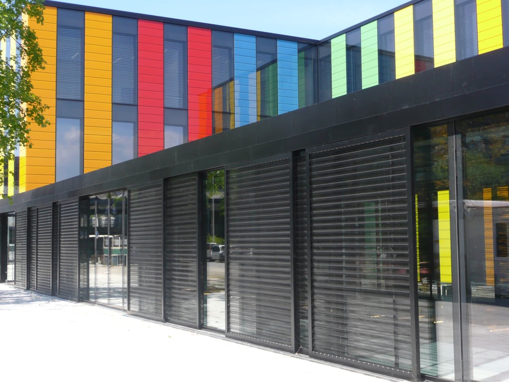 37 großformatige verschiebbare Gewebeelemente (jeweils 3,60 m hoch und 1,20 m oder 2,40 m breit) bilden einen schwarzen Kontrast zu den darüber liegenden bunten Glaspaneelen der Fassade. Das Spiralgewebe vom Typ Escale 7×1 wurde horizontal und vertikal mit Augenschrauben in Stahlrahmen verspannt.