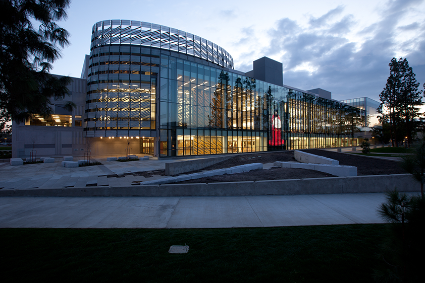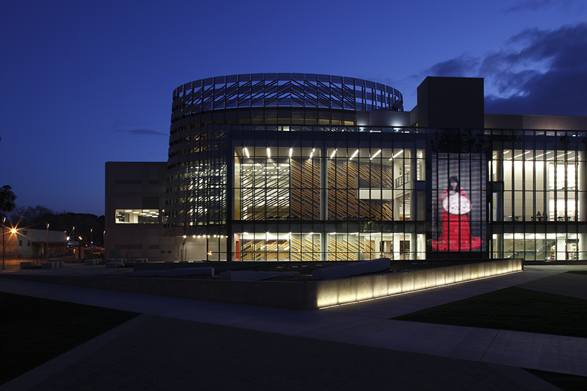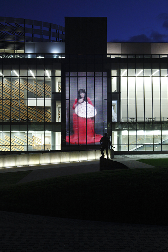 Diese Bibliothek zeigt eine Videoinstallation, die einen Korbflechter über einen Zeitraum von 12 Monaten bei der Arbeit zeigt. Das Video, das auf einer transparenten Fassade von GKD Mediamesh gezeigt wird, die im Inneren des Gebäudes hinter einer großen Glasfassade angebracht ist, zeigt den gesamten Flechtprozess über einen kontinuierlichen Zeitraum von zwei Wochen.