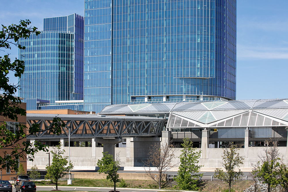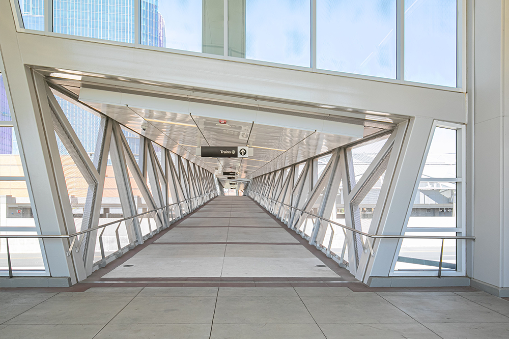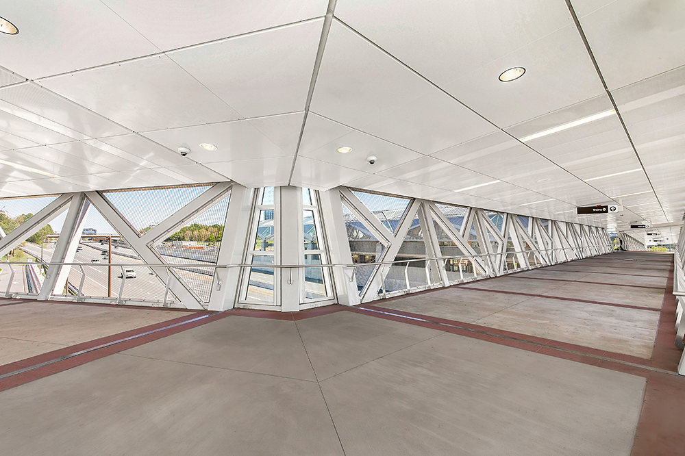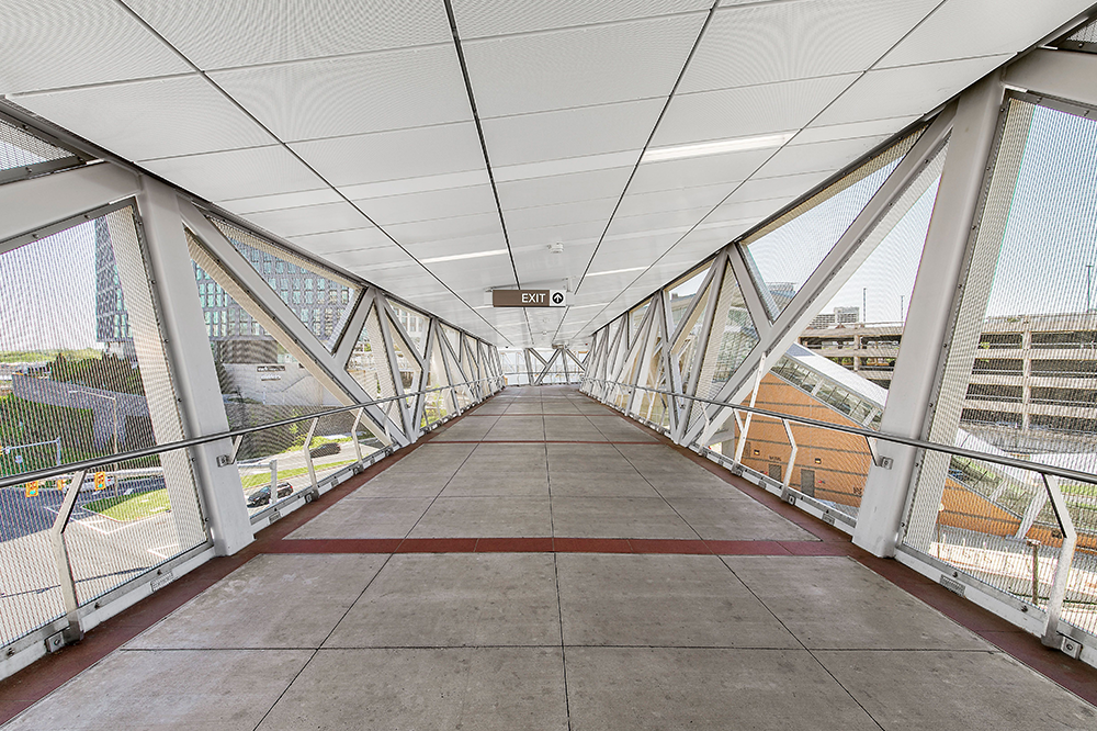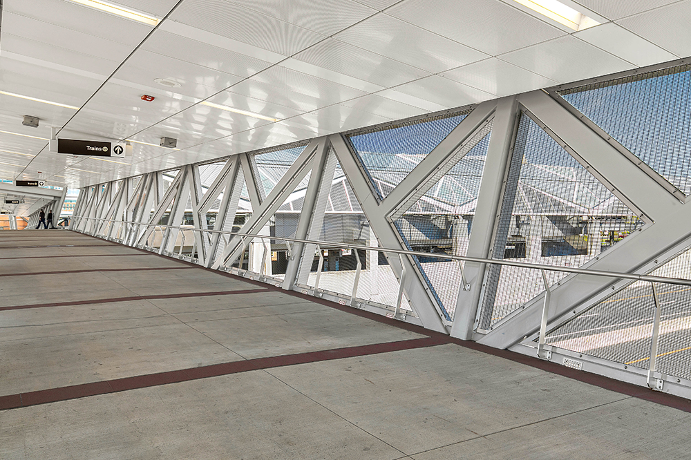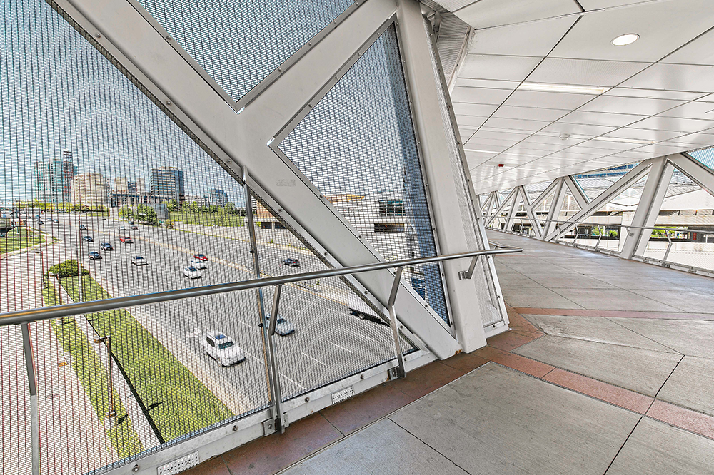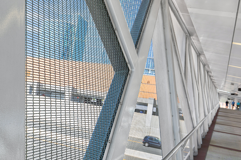 Die Silver Line Rail Extension bringt eine neue Phase des Transits in die Hauptstadtregion Washington, DC, indem sie neue Bahnverbindungen zum Washington Dulles International Airport schafft. Diese generationenübergreifende Infrastrukturinvestition in Nord-Virginia, die von der Washington Metropolitan Area Transit Authority (MWATA) angeführt wird, sieht sechs neue Bahnhöfe vor: Reston Town Center, Herndon, Ashburn, Loudoun Gateway, Innovation Center und Washington Dulles Airport. Um die neuen Bahnverbindungen fußgängerfreundlich zu gestalten, sahen die Architekten eine Kombination aus Fußgängerbrücken und Tunneln vor, die die Bahnhöfe mit den Parkplätzen und Terminals verbinden. Unter Verwendung von GKD-Metallgeweben für natürliches Licht und Belüftung wurden die Produkte Ellipse 2 und 14 ausgewählt, die mit maßgeschneiderten Edelstahlrahmen versehen wurden, um das geometrische Design der fünf Brücken und Bahnhöfe zu vervollständigen.