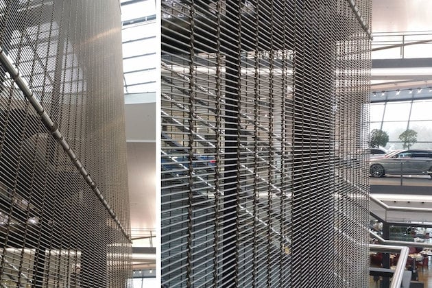 To create a suitably representative ambiance to match, the elevator and the surrounding stairwell of the new car collection center located here were clad in Tigris stainless steel fabric. The transparent fabric symbolizes high quality, emphasizes the aesthetics of the architecture – which is characterized by openness –, and also serves as fall guard protection.