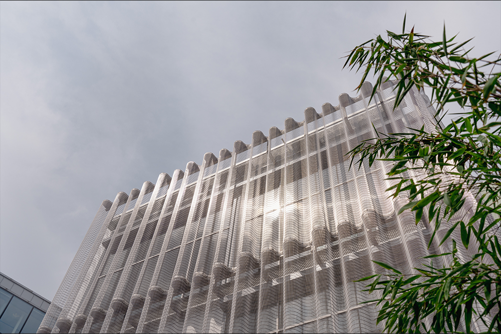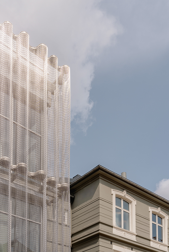 As part of the extension to the traditional Logen Theater in Bergen, architects 3RW opted for an expressive façade design with GKD metal fabric. The horizontally mounted TIGRIS panels form a wave-like structure that is visually reminiscent of a theater curtain and at the same time allows targeted views into the interior of the building. The tailor-made substructure and the special orientation of the mesh show how technical precision and architectural creativity can work together impressively.
