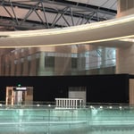 20. January 2023Golden metal fabric installation as transparent atrium cladding