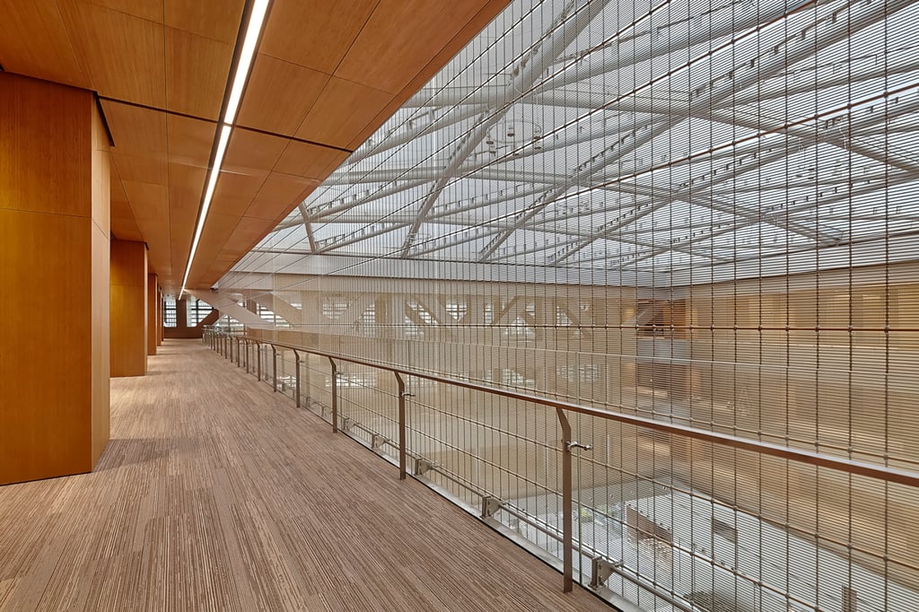 The golden metal fabric net clads the three-story atrium on three sides and spans an area of 1,850 m². Twenty-eight fabric panels, each 16.5 m x 4 m, form the hangings that shape the space and for which GKD specially developed an innovative custom fabric. To create it, golden-anodized aluminum wires and tubes were interwoven in three-wire warp wire groups made of untreated stainless steel at alternating intervals. The various diameters of the fabric components – four-millimeter-thick wires and twelve-millimeter-thick tubes – normally lead to significant differences in tension. However, these were completely balanced out in the weaving process so that the architectural fabric reliably meets the static requirements. GKD also demonstrated its decades of expertise when installing the fabric hangings: The aluminum tubes had to be aligned precisely in the panels to create the appearance of a continuous texture. Definition of the golden color to be used was also a particular challenge. It needed to appear homogeneous across the entire area of the fabric and meet the high expectations of the architects with regard to the appearance of the fabric when viewed in various light conditions. The soft golden tone selected lends the atrium a subtle luster and the lobby a sense of warmth to contrast with its cool gray marble floor, walls, and aluminum screens. In the atrium itself, the gold of the fabric cladding matches the wooden finish of the wall and ceiling cladding. All in all, a sophisticated architectural calling card at the central location of the Tencent headquarters, one of the most significant Internet firms.
