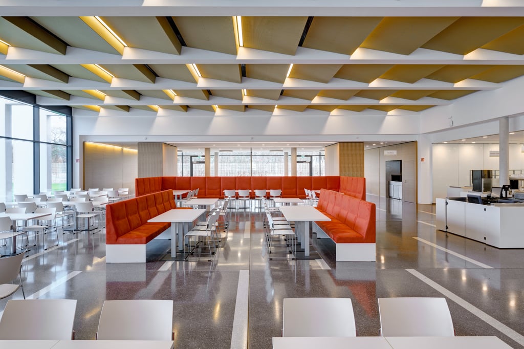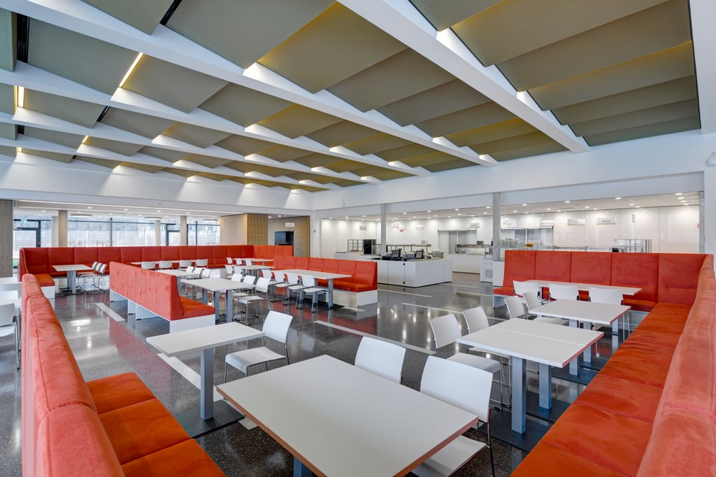 The European Organisation for the Exploitation of Meteorological Satellites was given a new six-story office building at its site in Darmstadt – including a canteen with a modern design featuring a suspended metal mesh ceiling made of gold-colored aluminum mesh from GKD.
