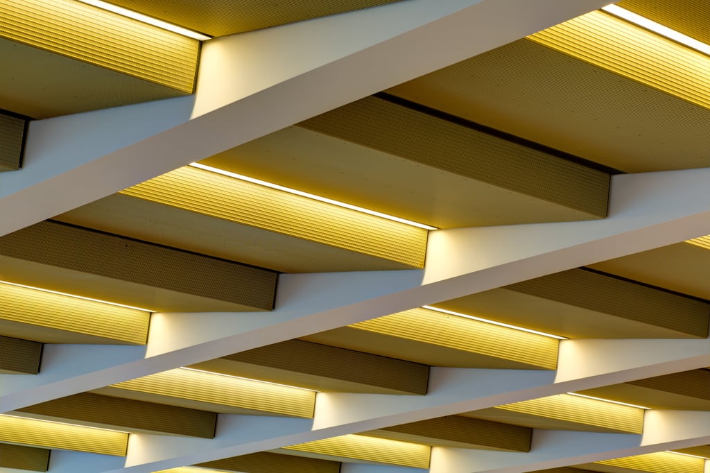 The 120 lamella-style elements of the 400-square-meter ceiling mesh create an impression of sun beams through their unobtrusive shimmer and the integrated LED lighting strips. At the same time the metal mesh contains ventilation technology and allows for a slight adjustment of the ceiling elements.
