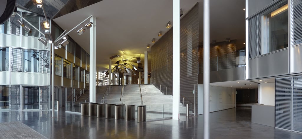Architect Perrault replaced the old centre of the building complex with a new, larger one that accommodates an entrance area of 5,000 m² . A canopy made of polished stainless steel adorns the main entrance. The glossy aesthetics of this entrance area continue inside the building and allow daylight to flood in. Ceiling-high stainless steel mesh room dividers from GKD represent another architectural highlight in the 1,500 m² foyer. The ten shimmering mesh panels appear either transparent or opaque, depending on the illumination and viewing angle. The spiral mesh and its reflections in the curved, seven-millimeter-wide stainless steel bands lend the space a sense of lightness and dynamism. The up to 9.5 metre high and up to six metre wide stainless steel panels also serve as staircase cladding and fall guard protection (mesh: ‘Escale 7 x 2’) on the balustrades and as visual screening (mesh: ‘Escale 7 x 1’).