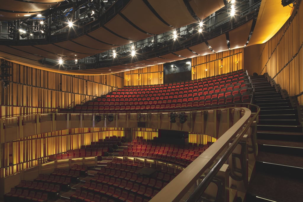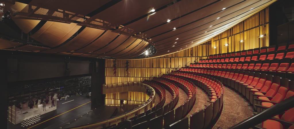 Traditional and modern architecture were merged in the 150-year-old center for the performing arts. In line with this concept, stainless steel mesh with weft wires coated in Venezia Gold was chosen for the suspended ceiling and the balustrades.