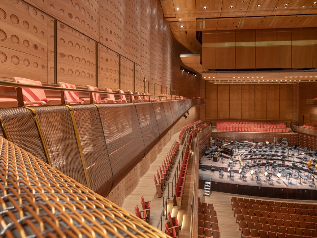Its fine structure significantly improves the sound quality by distributing the sound evenly throughout the room. At the same time, the fabric conceals some of the necessary technical equipment in the concert hall. Movable acoustic reflectors, also covered with aluminum mesh and suspended from the ceiling, enhance the acoustic effectiveness and contribute to the homogeneous appearance.