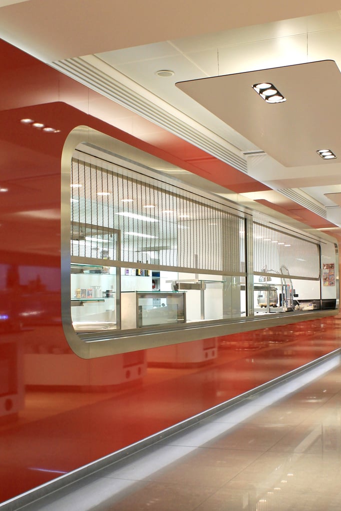 Con el tejido de acero inoxidable Tigris de GKD se realizó un cierre tipo persiana multifuncional en el servicio de comidas.