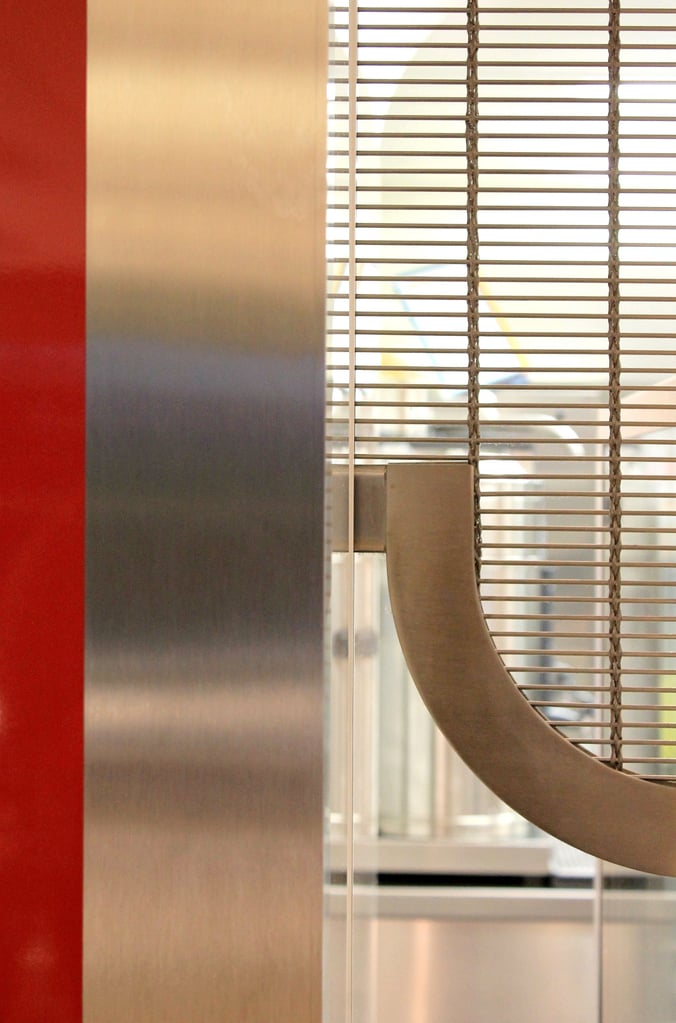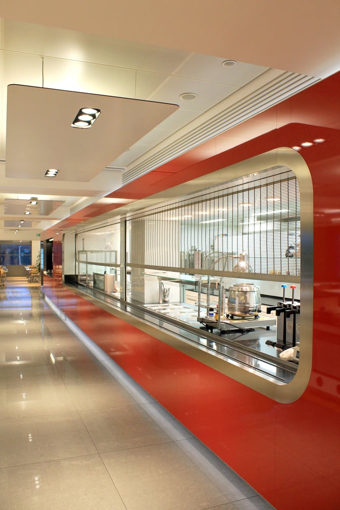 Dos mallas metálicas de acero inoxidable enrollables eléctricamente (cada uno de 4 metros de ancho y 1,20 metros de alto) le otorgan al servicio de comidas un acabado brillante. Fuera del horario de trabajo, los tejidos de acero inoxidable se ocupan de mantener cerrado de forma segura el lugar de trabajo situado al fondo de la sala. El interior de la cantina decorado íntegramente de blanco y rojo es parte del nuevo edificio de una empresa de renombre de Münster (Alemania). El nuevo edificio fue diseñado por el estudio de arquitectura Vervoorts & Schindler.