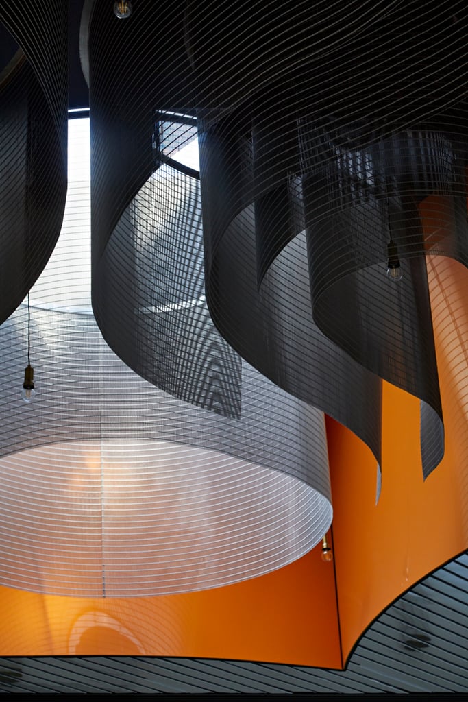 El excepcional techo suspendido hecho de tiras de tejido brillantes recuerda a ondas de tejido de caída suave.La estructura textil del tejido de acero inoxidable destaca dicha impresión.La construcción de techo consta de 24 elementos tejido (cada uno de 1,20–1,80 m de alto y 2,90–7,00 m de largo). Las tiras de tejido están fijadas de forma centrada en el techo dede su lado longitudinal. Otro elemento que destaca en el espectacular diseño de techos es el marco naranjo de la malla metálica curvada.