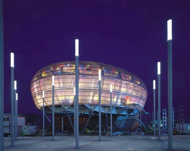 La fachada de tejido transparente resultante sirve como protección solar y como elemento de diseño multifacético y visible a grandes distancias. La superficie reflectante del tejido arquitectónico plateado se presenta como un sutil y vivaz reflejo del mundo exterior: sol, nubes, colores, luces. Al mismo tiempo, la fachada de tejido brillante ofrece una gran superficie para asociaciones individuales. Gracias a la transparencia del tejido y una iluminación laboriosa por la parte trasera, el pabellón pareciera estar brillando cuando comienza a ponerse el sol.