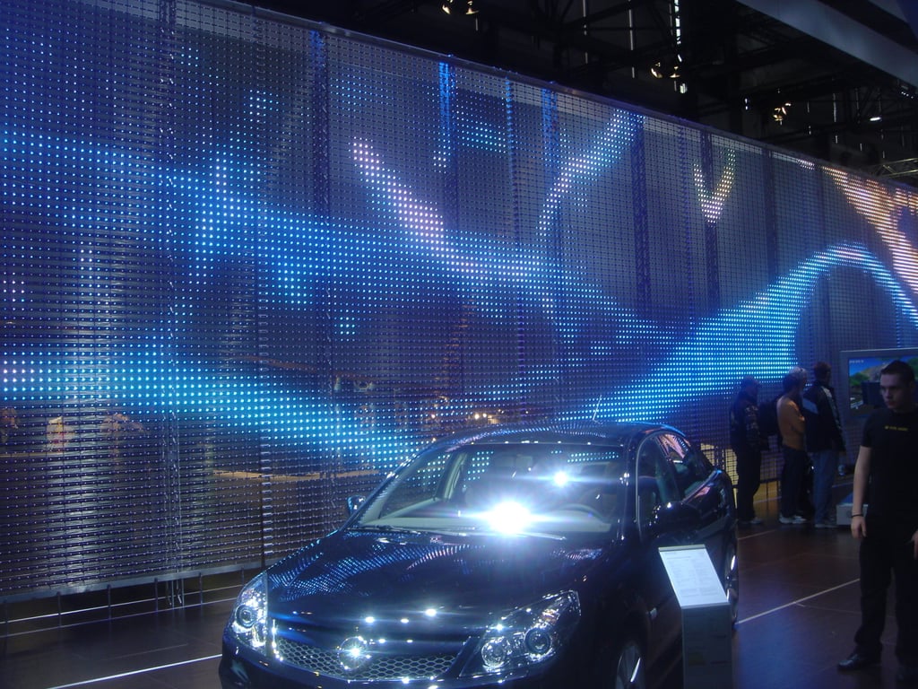 Se instaló una fachada mediática transparente con Mediamesh® de GKD en el stand de Opel en el Salón Internacional del Automóvil de Ginebra. Este moderno diseño de stand atrajo todas las miradas. Las paredes posteriores medializadas, con la tecnología LED más moderna y una superficie total de 195 m², sirvieron para la presentación del Opel Corsa: La animación de llamas blancas y azules sobre la superficie de la pantalla Mediamesh®, combinada con los ardientes ritmos de la Capoeira, resultó en una impresionante puesta en escena multimedia durante la feria.