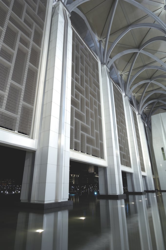 En la fachada de la mezquita de Tuanku Mizan Zainal Abidin, en el ultramoderno centro administrativo de Putrajaya, 4.300 m2 de tejido en espiral de acero inoxidable Escale 7×1 proporcionan las mejores condiciones climáticas. Además, el tejido en espiral semitransparente ofrece a los visitantes una protección solar fiable, y los protege de la lluvia oblicua.