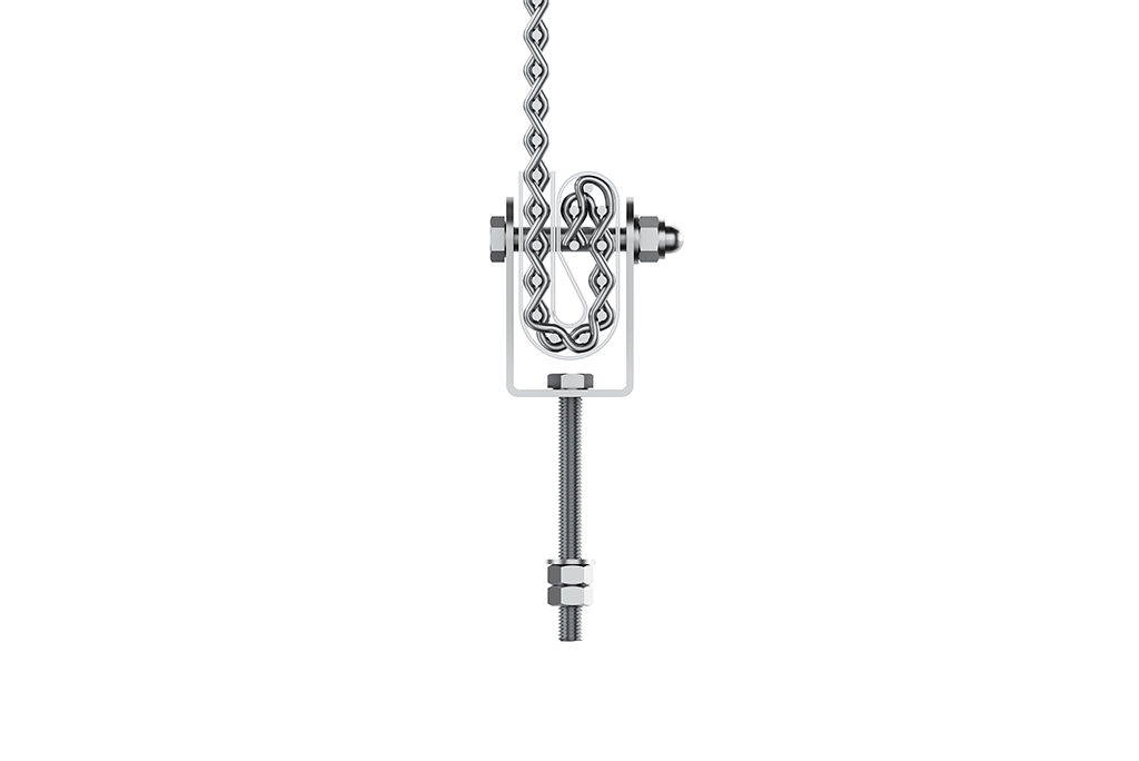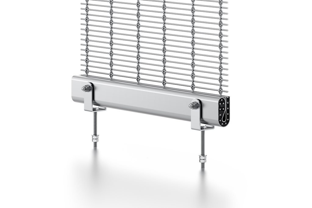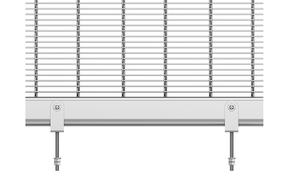 Pour les tissus métalliques en PC. Le tissu est plié aux deux extrémités à l’aide d’une tôle, le pli ainsi formé est saisi à l’aide de vis à fourche. Les toiles sont installées de manière précontrainte avec cette feuillure. Cette fixation transmet ensuite à la sous-construction les forces qui se produisent, telles que les charges dues au vent et/ou les charges d’impact.