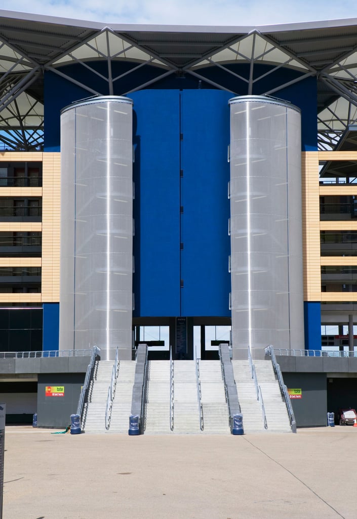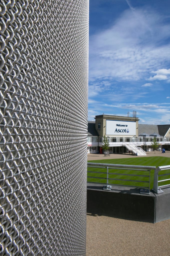 20. janvier 2023Habillage en maille métallique des tours abritant les escaliers : hippodrome d’Ascot