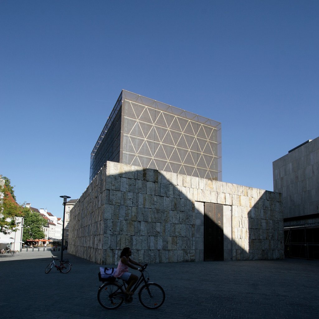 La nouvelle synagogue constitue le centre du « Jüdische Zentrum » de Munich, réalisé d'après les plans du cabinet d'architecture sarrebruckois Wandel Höfer Lorch + Hirsch.