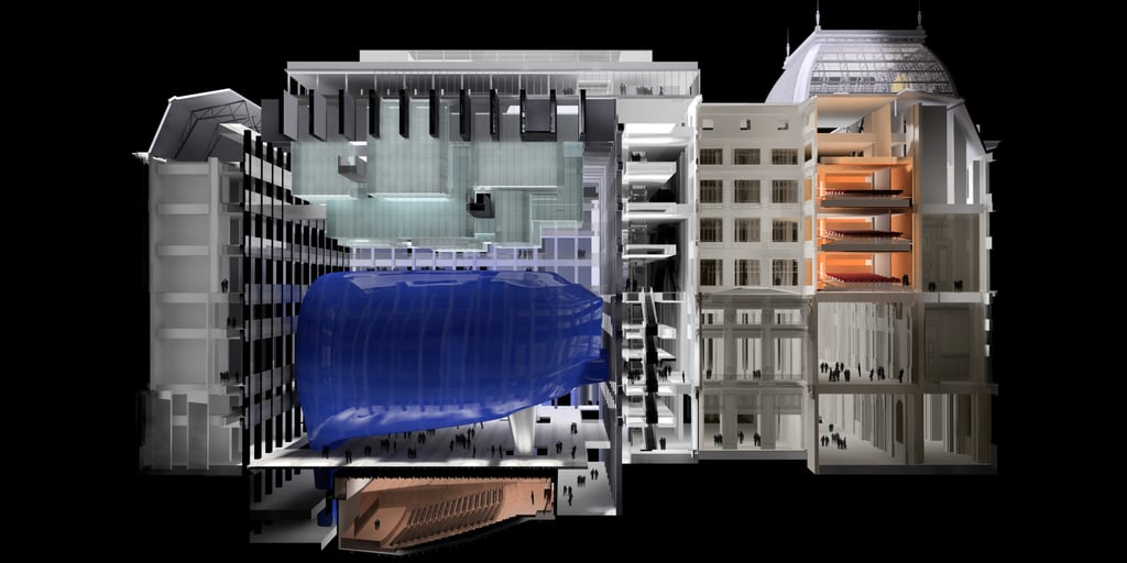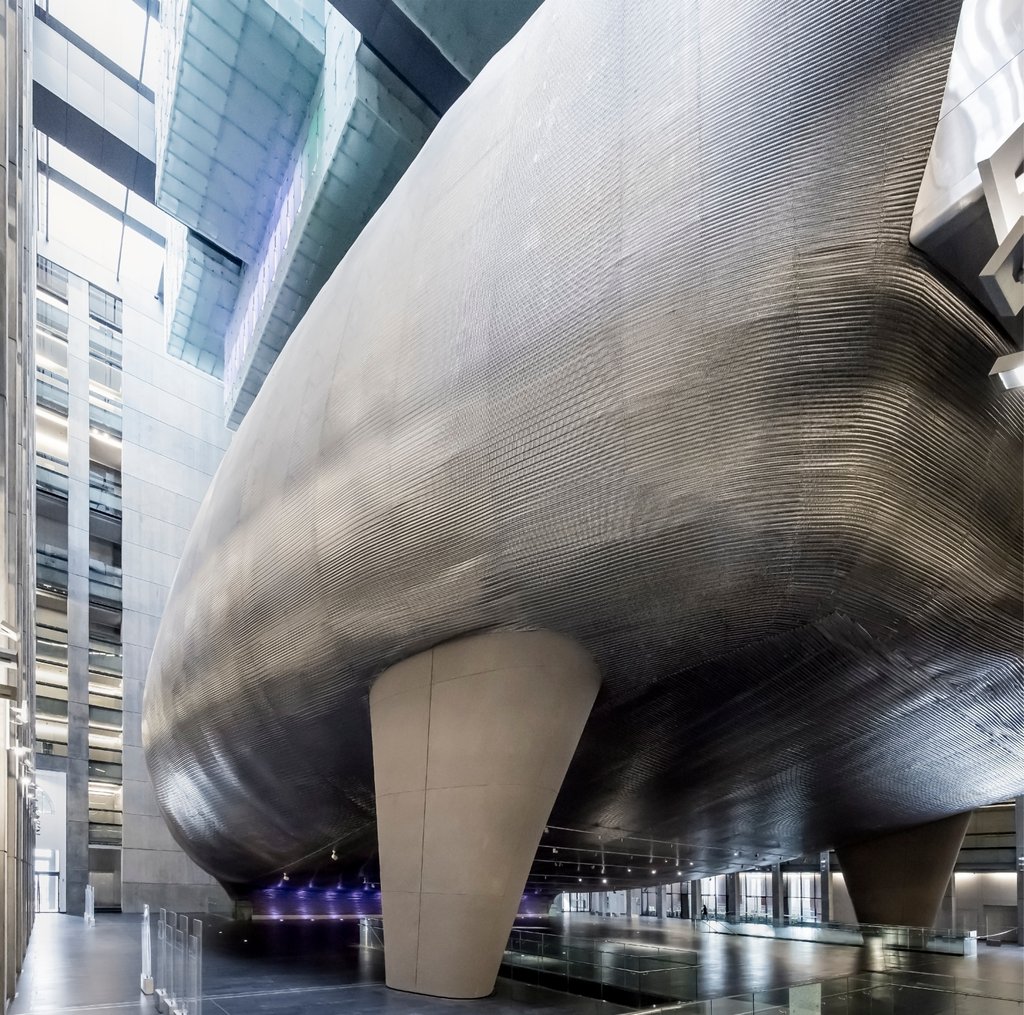 Pour le Centro Cultural Kirchner, les architectes du cabinet argentin B4FS ont élaboré un habillage fascinant de la salle de concert. En raison de sa forme et de la couleur bleue réfléchie par ses murs et son socle, le cœur pour le moins surprenant du centre culturel a été surnommé Ballena Azul (la Baleine Bleue).