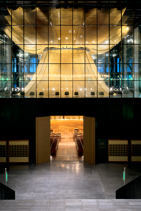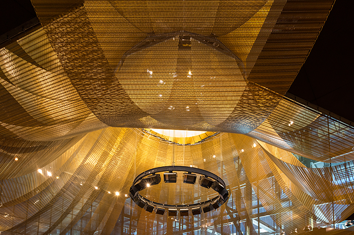 L’architecte Dominique Perrault a entouré l’ancien corps de bâtiment du Palais de Justice d’un anneau de deux étages, monté à 11 m de hauteur. La salle atteint son point culminant avec la gigantesque installation d’un plafond suspendu fluide aux reflets dorés en maille spiralée Escale 5×1. La construction circulaire tridimensionnelle impressionne par ses seules dimensions : env. 10 m de haut et jusqu’à 19 m de large et env. 28 m de long. 40 éléments en maille trapézoïdaux se chevauchant se déploient en corolle depuis une coupelle centrale. Ainsi, les panneaux de mailles varient de 5,65 m à 18,35 m en longueur et de 1,10 m à 4,50 m en largeur. 1 387m² de maille design sur mesure ont été installés au total.