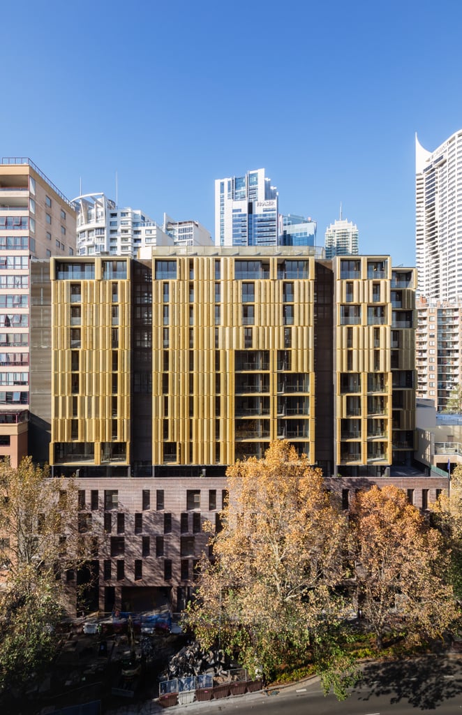 Le complexe commercial et résidentiel de 15 étages Radiance Apartments, situé dans la zone culturelle et de loisirs de Darling Harbour, un quartier de Sydney, a été doté d’une façade assurant la protection thermique à la fois fonctionnelle et élégante, faite d’éléments en maille mobiles de couleur dorée. Afin de générer son look spécifique, la maille en aluminium PC-ALU 6010 a été anodisée or. La structure textile de la maille pour l’architecture résistant aux intempéries protège des rayons directs du soleil et sert de protection thermique estivale. Grâce à la réduction de l’apport thermique, le bâtiment se réchauffe moins en été et la consommation d’énergie des systèmes de climatisation s’en trouve réduite. La façade assurant la protection thermique préserve également la vie privée. Elle fait écran aux regards indiscrets de l’extérieur, tandis que, grâce à la structure transparente de la maille, la vue depuis l’intérieur n’est pas entravée. La translucidité de la maille pour l’architecture crée une atmosphère agréable et lumineuse à l’intérieur du bâtiment pendant la journée. À la différence d’une protection solaire qui assombrit l’intérieur, il est possible de faire des économies d’éclairage électrique à l’intérieur des pièces.