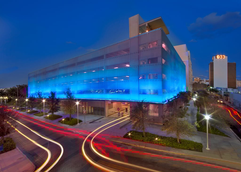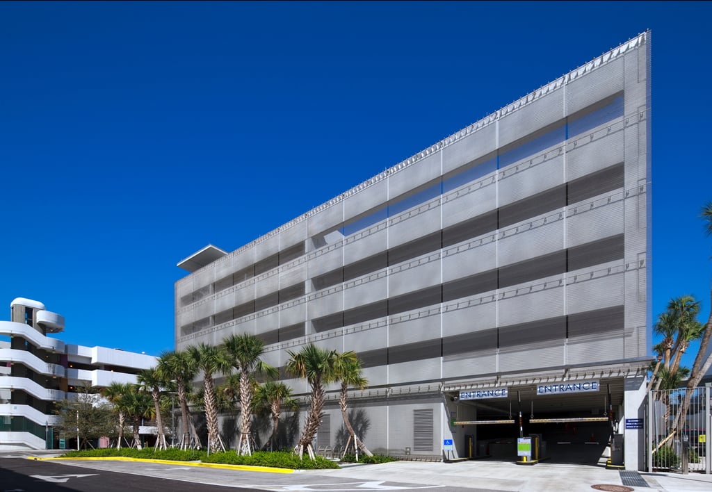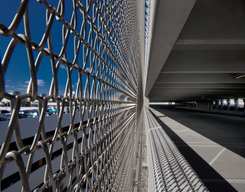 La façade du parking, d’une superficie de presque 2 500 m², est illuminée en couleur par des LED implantées au sol et se présente à la fois comme attraction pour le regard et comme enveloppe multifonctionnelle du bâtiment. La façade en maille sert de protection garde-corps et contre les intempéries ; elle résiste aux ouragans ainsi que – grâce à la maille en fil inox hautement allié – à l’air salin auquel le parking est confronté du fait de sa proximité de la mer. Simultanément, la structure ouverte de la maille spiralée ignifuge assure une aération naturelle du bâtiment. Des ouvertures pour des bouches d’incendie avec des plaques de recouvrement soudées permettent un accès rapide en cas de besoin.