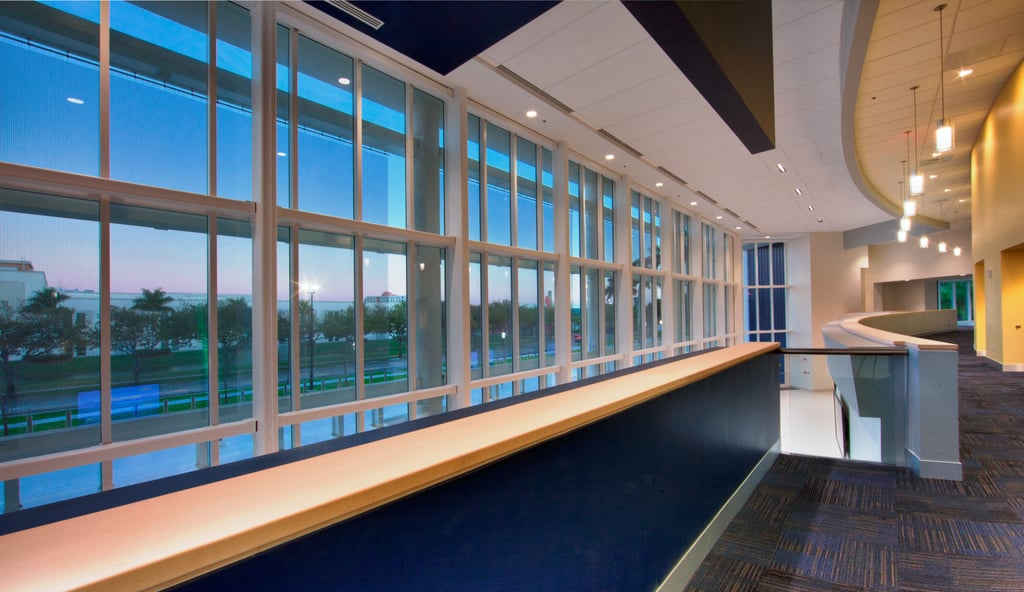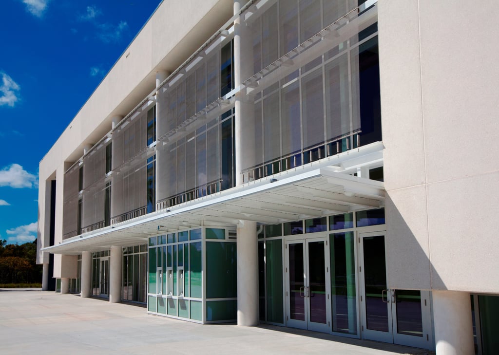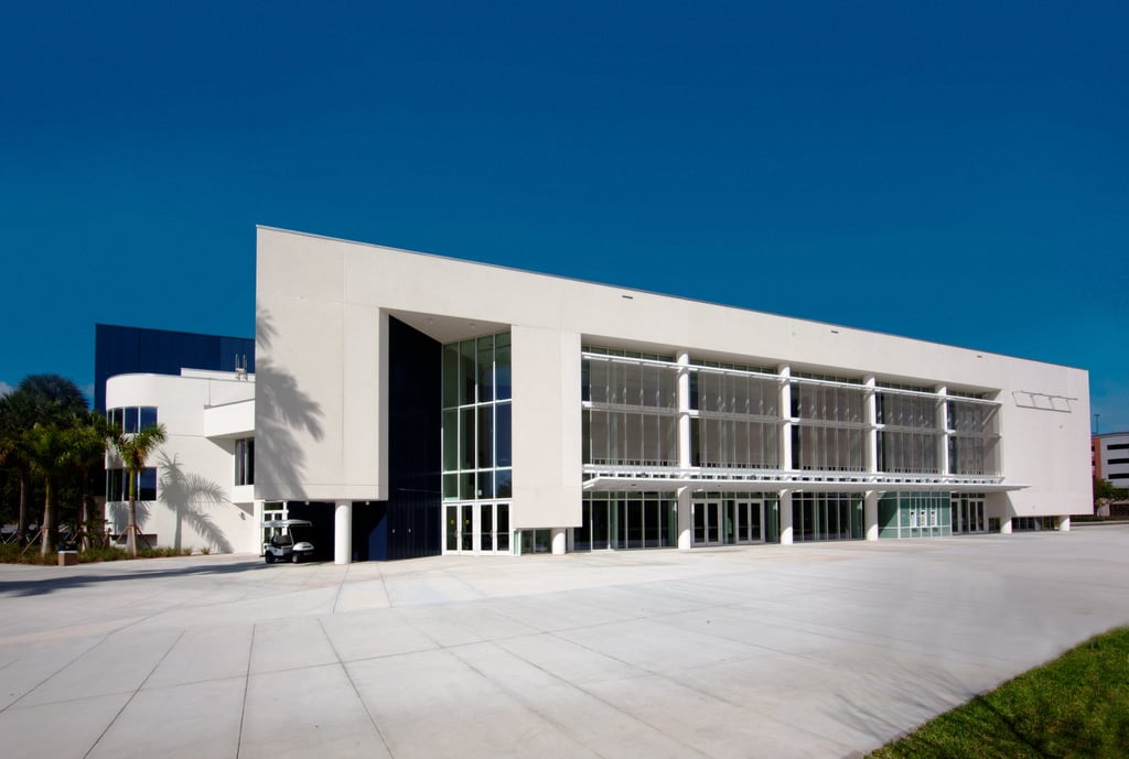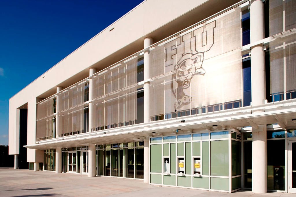 Une façade brise-soleil transparente de haute qualité, agrémentée du logo du FIU Golden Panther – centré au-dessus de l’entrée de la Century Bank Arena.