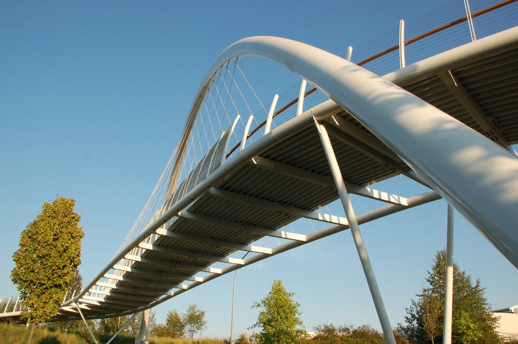 La passerelle habillée de maille métallique GKD relie un quartier résidentiel aux écoles situées de l’autre côté d’une voie rapide à quatre files. L’habillage en maille inox assure, en tant que garde-corps, la sécurité des passants.