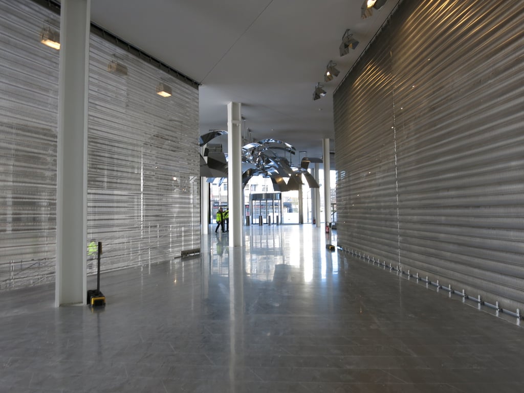 Le hall d’entrée du complexe immobilier, d’une superficie de 1 500 m², a été structuré par des cloisons allant du sol au plafond en maille pour l’architecture GKD.