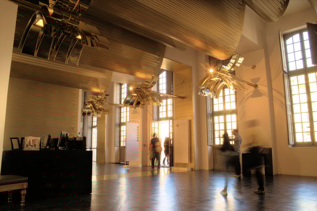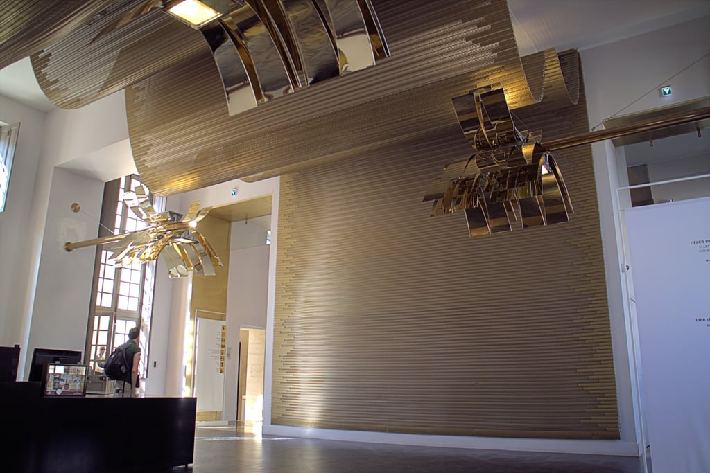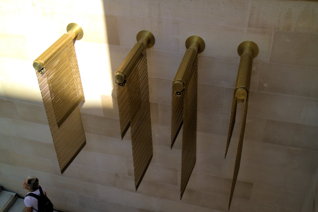 Dominique Perrault a réaménagé le Pavillon Dufour en utilisant une maille métallique exclusive produite par GKD. Cette dernière accompagne les visiteurs de l’entrée jusqu’au nouvel auditorium installé au troisième étage du bâtiment. Des panneaux muraux perforés et des guirlandes suspendues au plafond – tous réalisés en maille pour l’architecture anodisée or de GKD – visualisent pour le public le chemin à suivre dans les ailes du Pavillon Dufour, dans un lieu jadis réservé à la noblesse.