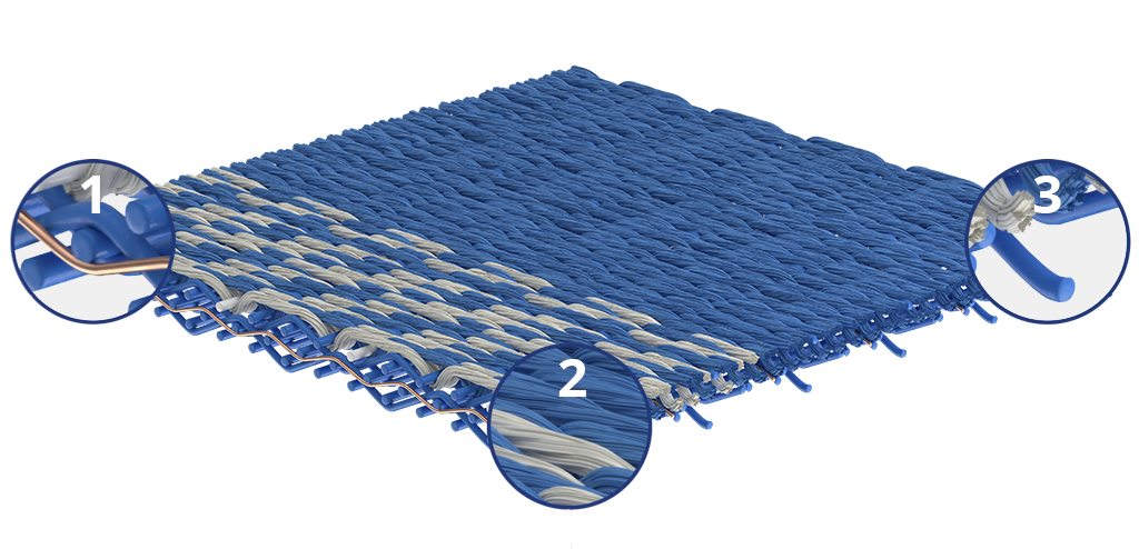 3 – Toile de support en monofilaments: Évite le risque d’allongement du tapis pendant toute sa durée de vie. Un haut niveau de stabilité transversale est garanti et le temps de montage est réduit.